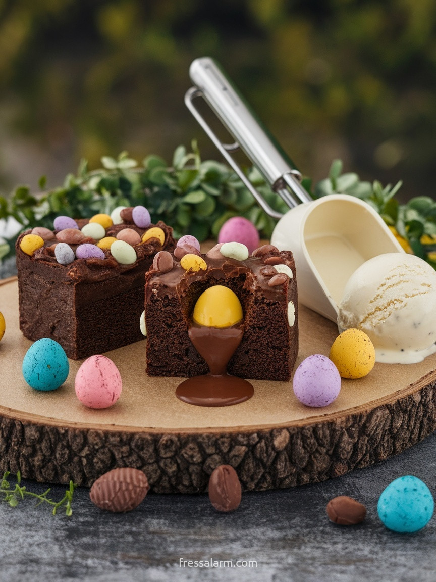 Warm serviert mit einer Kugel Vanilleeis und einem Löffel heißer Schokoladensoße wird der Brownie zu einem vollständigen Oster-Dessert. Die Wärme des Brownies lässt die eingebackenen Schokoladeneier leicht anschmelzen – ein perfekter schmelzender Schokoladenmoment.
