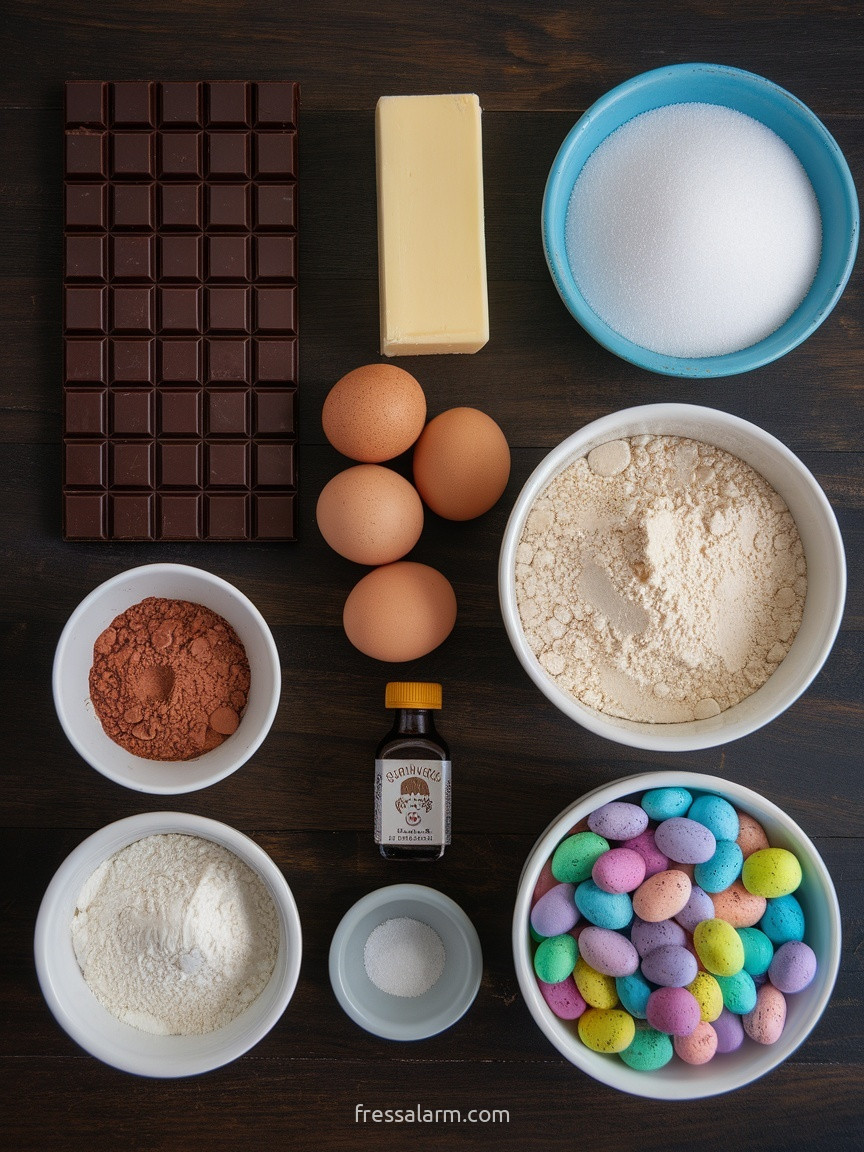- 150 g bunte Mini-Schokoladen-Ostereier (z.B. Smarties-Eier, Mini-Cadbury-Eggs)