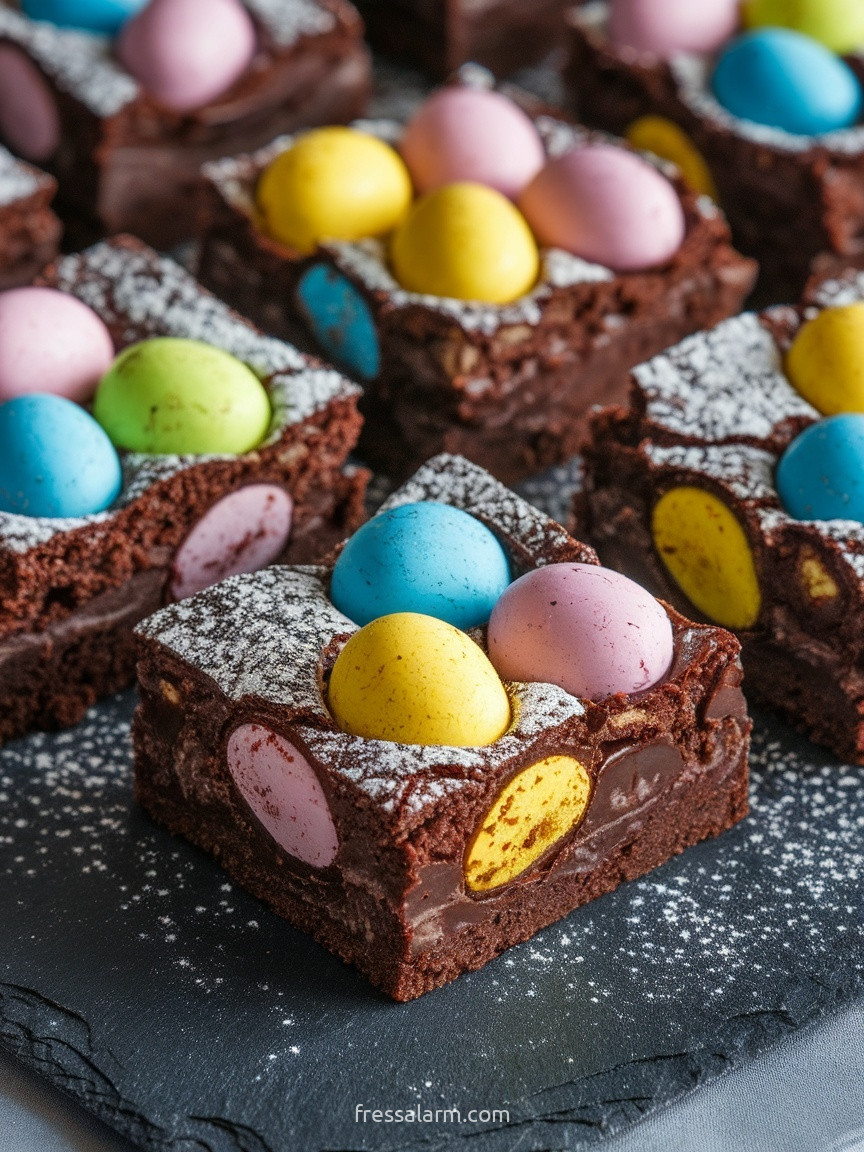 Die Brownies auf einem schwarzen Schieferbrett oder dunklem Holzbrett anrichten – die bunten Ostereier leuchten auf dem dunklen Hintergrund und machen das Tablett zu einem echten Hingucker. Mit Puderzucker leicht bestäuben für einen eleganten Finish der den Kontrast noch verstärkt.