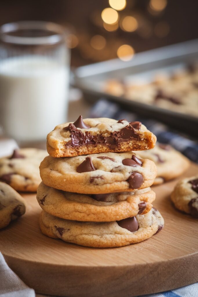 Chocolate Chip Cookies passen zu fast allem: Sie schmecken fantastisch zu einem Glas Milch, zu Kaffee oder heißer Schokolade. Besonders schön ist es, die warmen Cookies leicht anzuknacken und das Innere mit noch geschmolzenen Schokoladenstückchen zu genießen. Serviere sie auf einem Holzbrett, auf einem Rost oder in einer weihnachtlichen Blechdose – so kommen sie besonders gut zur Geltung.