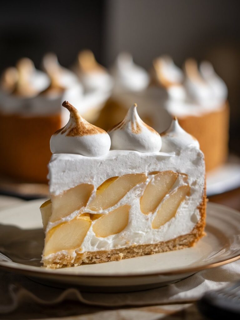 Ein festlicher Kuchen mit knusprigem Boden, cremiger Füllung, fruchtigen Birnen und fluffigem Baiser – genau richtig für besondere Anlässe oder gemütliche Kaffeerunden.