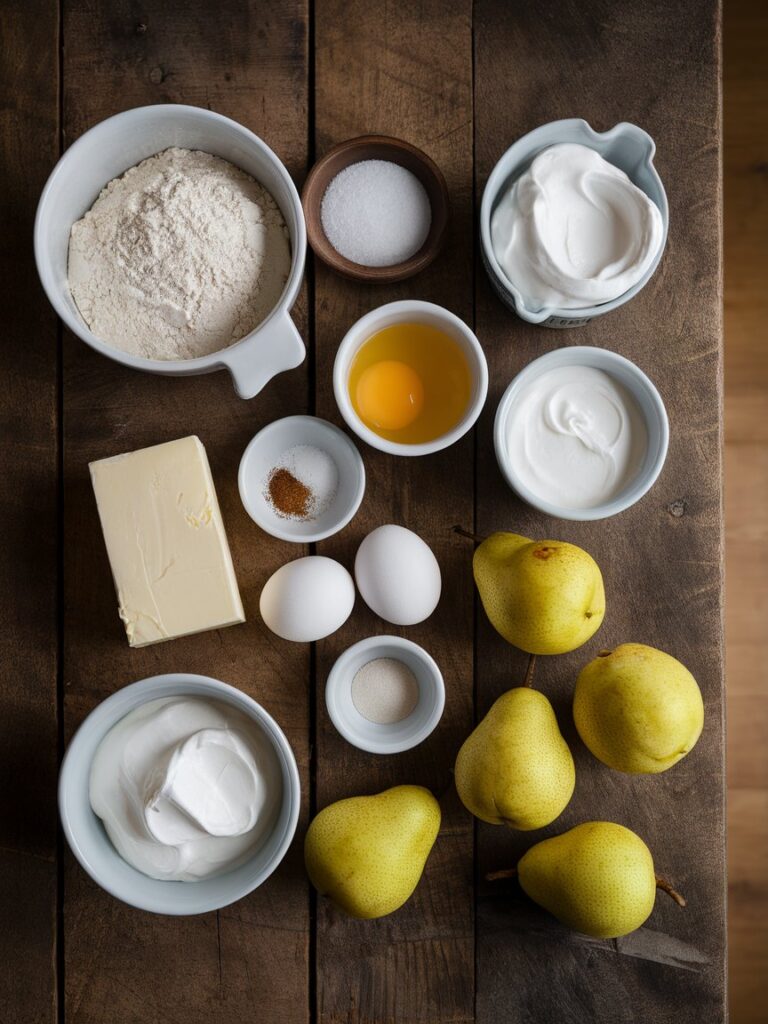 - Schichten: Birnenspalten auf dem Teig verteilen, Schmandcreme darüber geben.