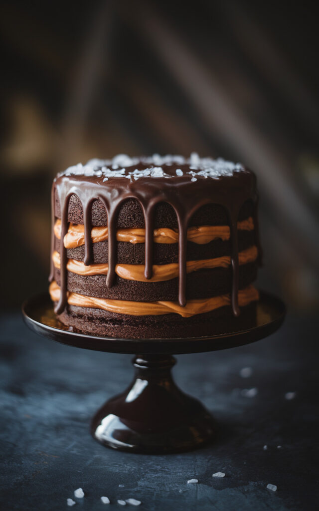 💡 Der fertige Kuchen ist ein dramatisches, dunkles Schichtgebäck mit goldenen Karamelldrizzles auf schwarzer Ganache, glitzernden Meersalzflocken und sichtbarem Karamell zwischen den Schichten.