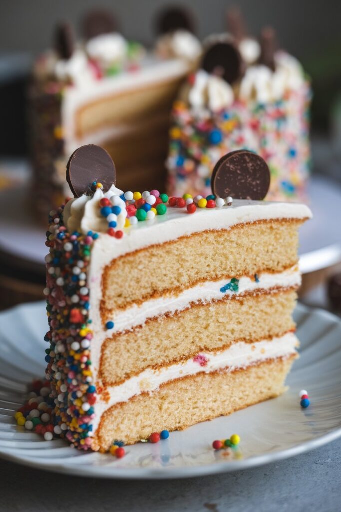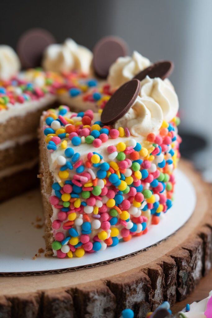 - Deko: Torte mit bunten Streuseln, Schokolinsen und Kerzen nach Belieben dekorieren.