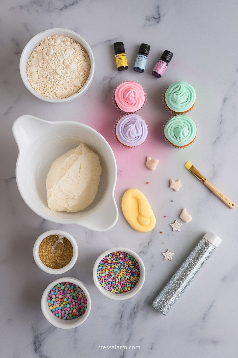 - Dreifarbige Vanilla-Buttercreme: 200 g Butter (weiß aufgeschlagen), 400 g Puderzucker (gesiebt), 2 EL Milch, 1 TL Vanilleextrakt; Gelfarben: Rosa, Lila, Mintgrün