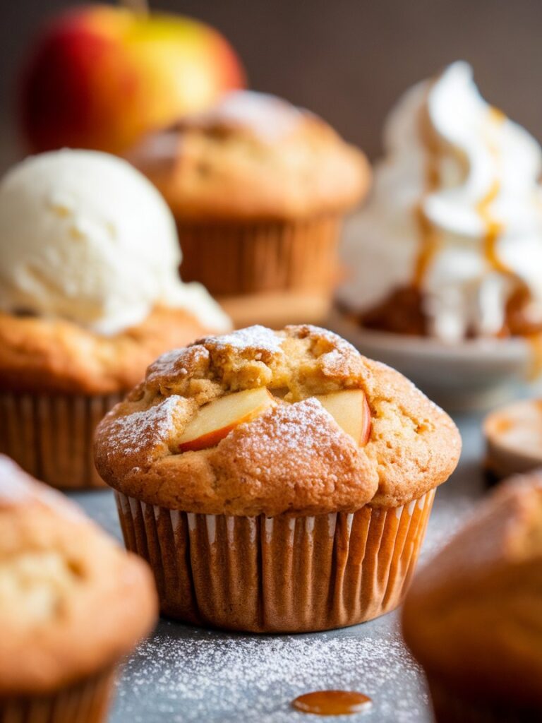 Apfel-Zimt Muffins schmecken pur köstlich, können aber wunderbar verfeinert werden: Mit einer Prise Puderzucker wirken sie besonders hübsch. Warm serviert mit einer Kugel Vanilleeis oder einem Klecks Sahne werden sie zum Dessert-Highlight. Auch eine Tasse Kaffee oder Tee harmoniert perfekt mit dem würzigen Aroma. Für ein festliches Buffet lassen sie sich zusätzlich mit Karamellsauce beträufeln.