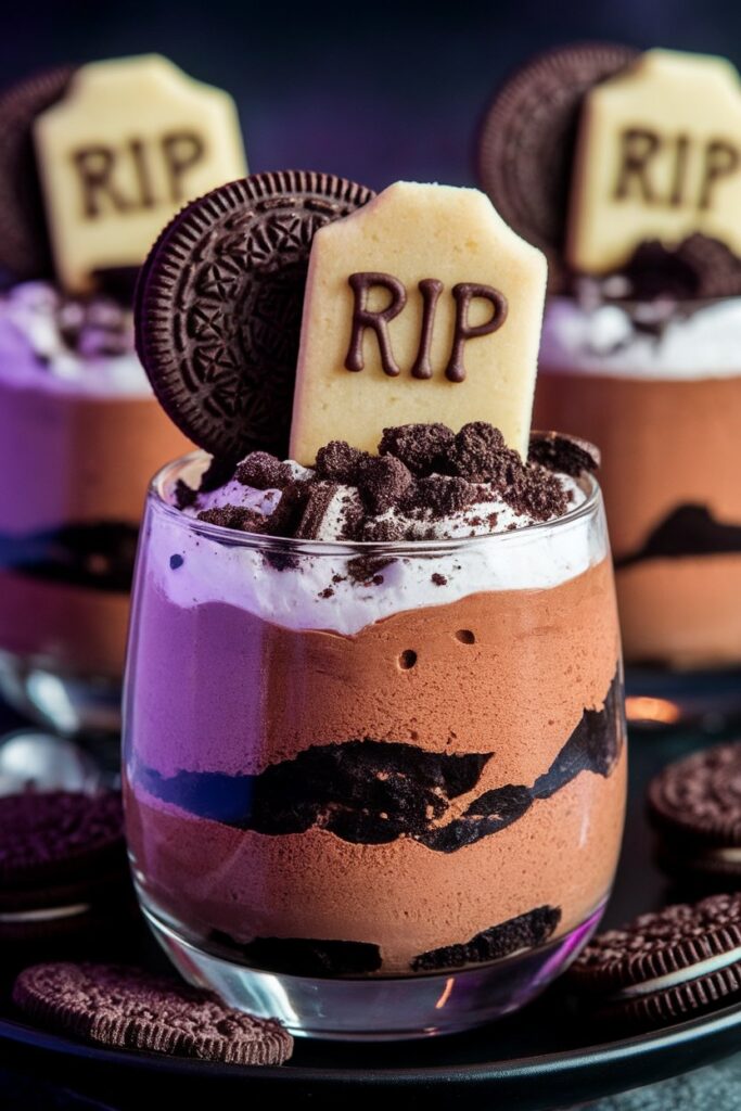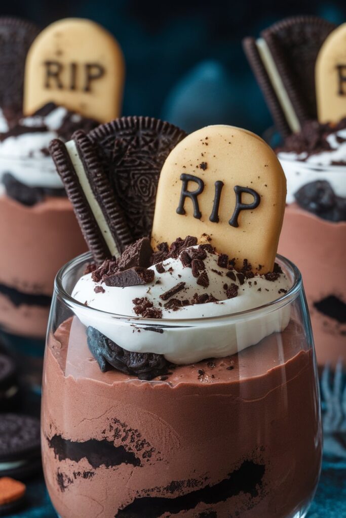 Dieses Schoko-Mousse mit Grabstein-Keks ist ein raffiniertes Halloween-Dessert, das schaurig aussieht und köstlich schmeckt. Eine luftige Mousse au Chocolat wird in Gläser geschichtet und mit zerbröselten Oreos garniert, die an dunkle Erde erinnern. Ein dekorativer „Grabstein-Keks“ macht das Dessert zu einem Hingucker auf jedem Halloween-Buffet – einfach, cremig und herrlich schokoladig.