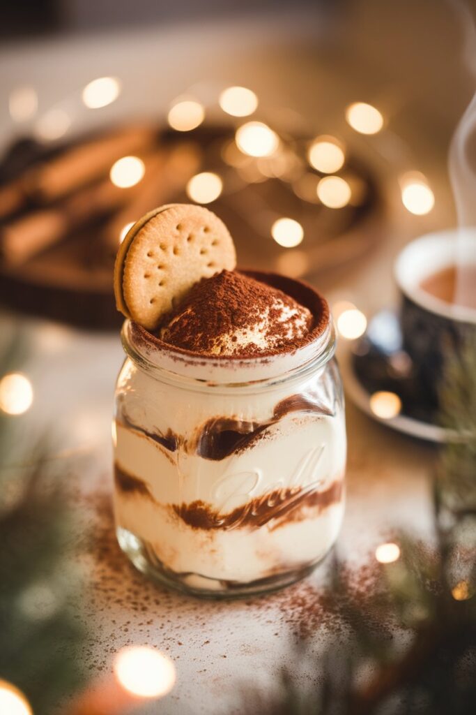 Serviere das Spekulatius-Tiramisu direkt im Glas – hübsch mit einem kleinen Löffel, etwas Kakaopulver und einer halben Spekulatius dekoriert. Ein Minzblatt oder ein paar Granatapfelkerne bringen zusätzlich Farbe und Frische. Besonders festlich wirkt es, wenn du das Dessert auf einem Holzbrett mit etwas Zimtstange und Sternanis präsentierst. Perfekt für weihnachtliche Dinner oder gemütliche Adventssonntage.