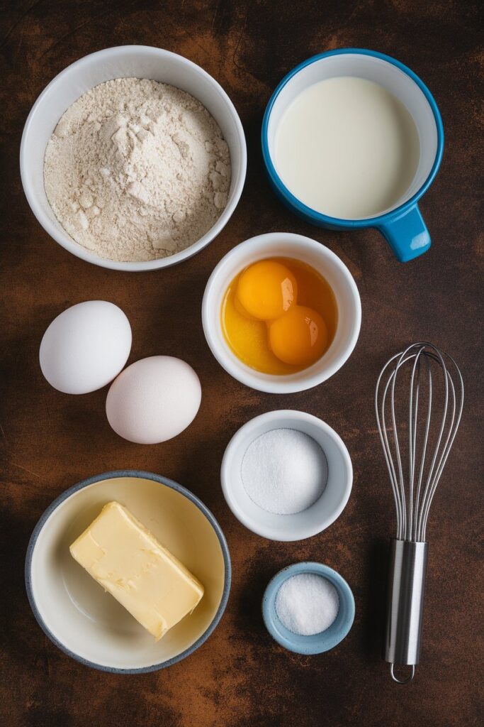 1. Teig herstellen: Mehl in eine Schüssel sieben und mit Salz (und Zucker bei süßer Variante) mischen. Eier hinzufügen und nach und nach Milch unter ständigem Rühren einarbeiten, bis ein glatter, dünnflüssiger Teig entsteht. Zum Schluss geschmolzene Butter unterrühren.
