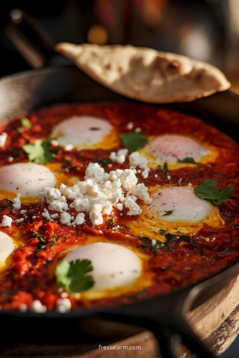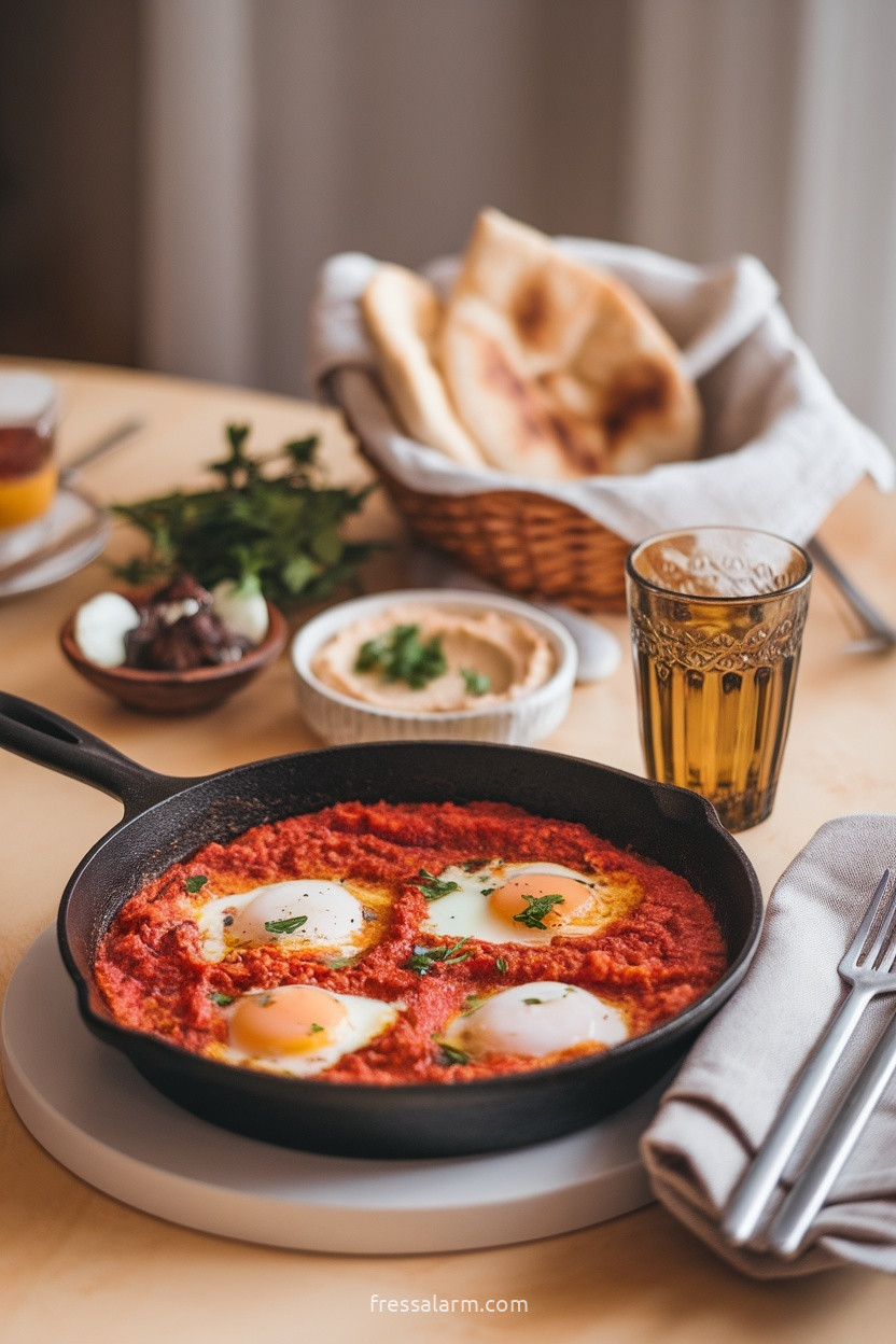💡 Die Shakshuka direkt aus der Pfanne am Tisch servieren – das ist die authentische Art und spart Geschirr. Mit frischem Pita-Brot zum Auftunken der Sauce und einem großen Löffel für alle.