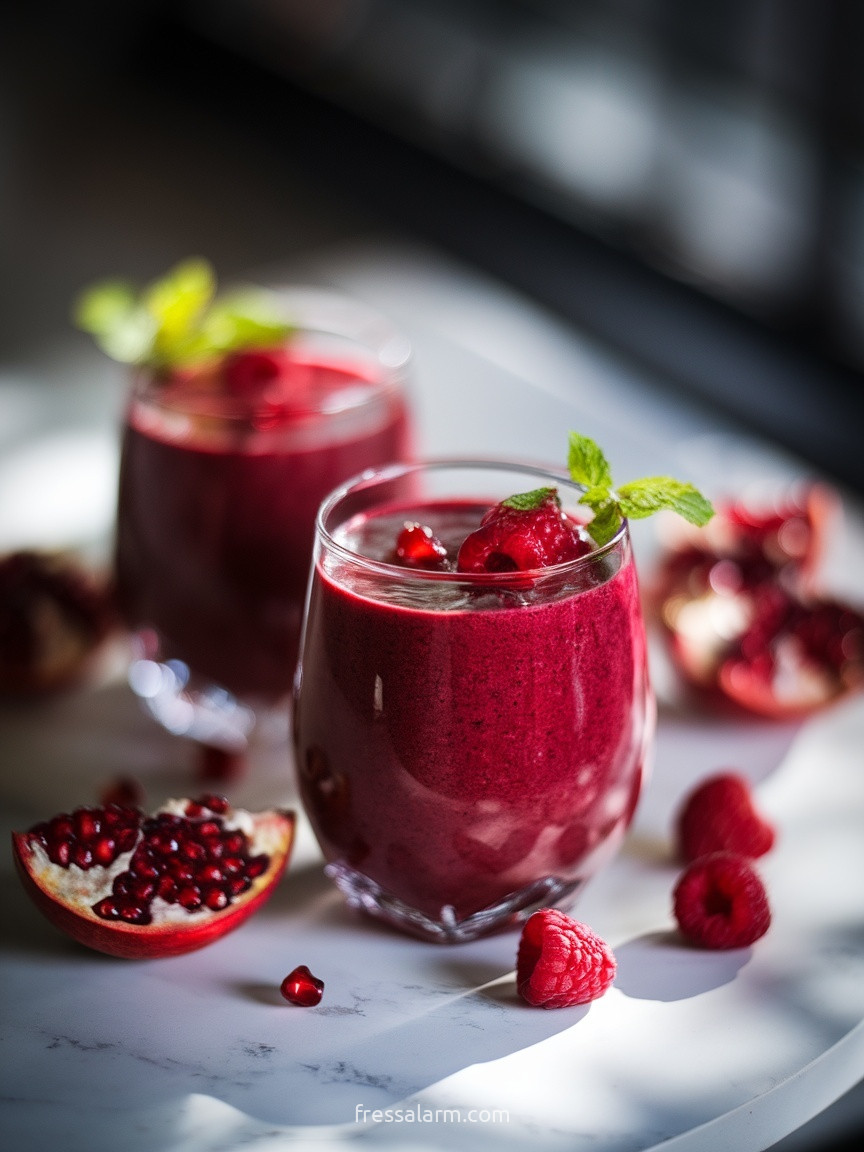 Den Himbeer-Granatapfel-Smoothie in dunklen oder klaren Gläsern servieren – die tiefe, dunkelrote Farbe ist das Hauptmerkmal und sieht in klarem Glas am spektakulärsten aus. Mit frischen Granatapfelkernen und einem Minzzweig garnieren.