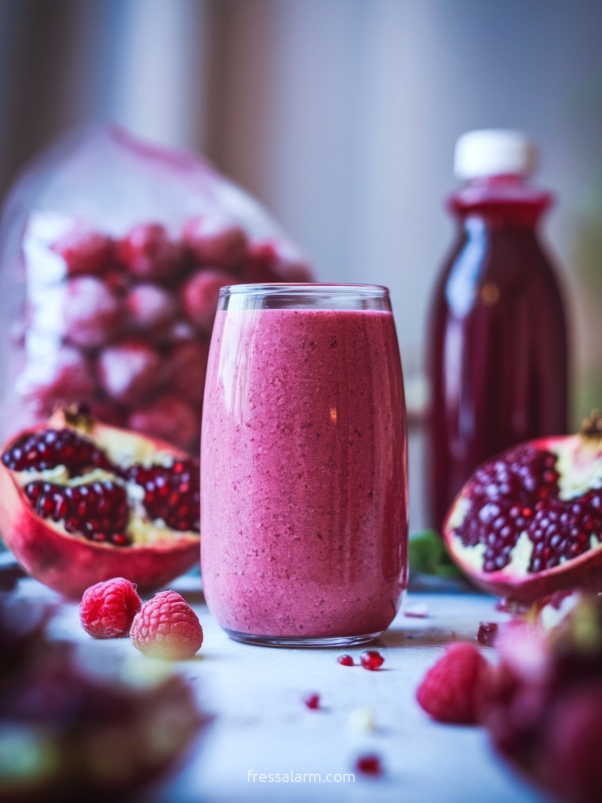 Der Himbeer-Granatapfel-Smoothie ist der schönste und aromatisch komplexeste Smoothie in diesem Set – tief, dunkelrot, reich an Antioxidantien und mit einem Geschmack, der über den Standard-Beeren-Smoothie weit hinausgeht.