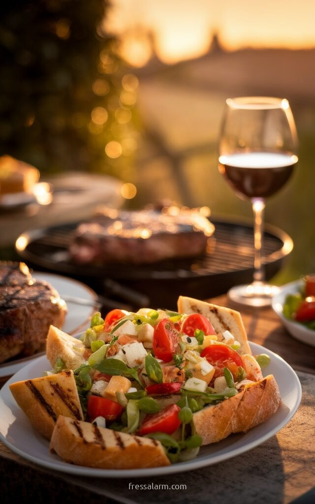 Panzanella als Grillbeilage passt perfekt zu Steaks und Lammkoteletts mit Kräuter-Marinade, zu gegrillten Meeresfrüchten und zu Grillkäse. Das Olivenöl-Dressing und die Tomatensäure ergänzen kräftige Grillgerichte hervorragend.