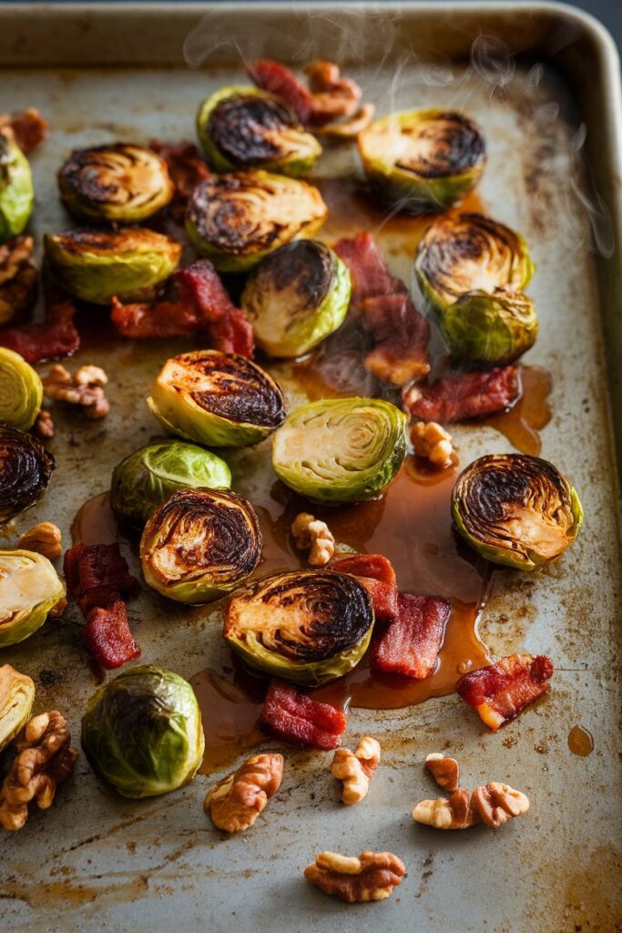 - Rosenkohl herausziehen, wenden, Ahorn-Senf-Mix darüber träufeln und Walnüsse aufstreuen. Weitere 5–6 Minuten rösten. Die Glasur karamellisiert und haftet in den Rillen – das gibt glänzende, knusprige Ränder.