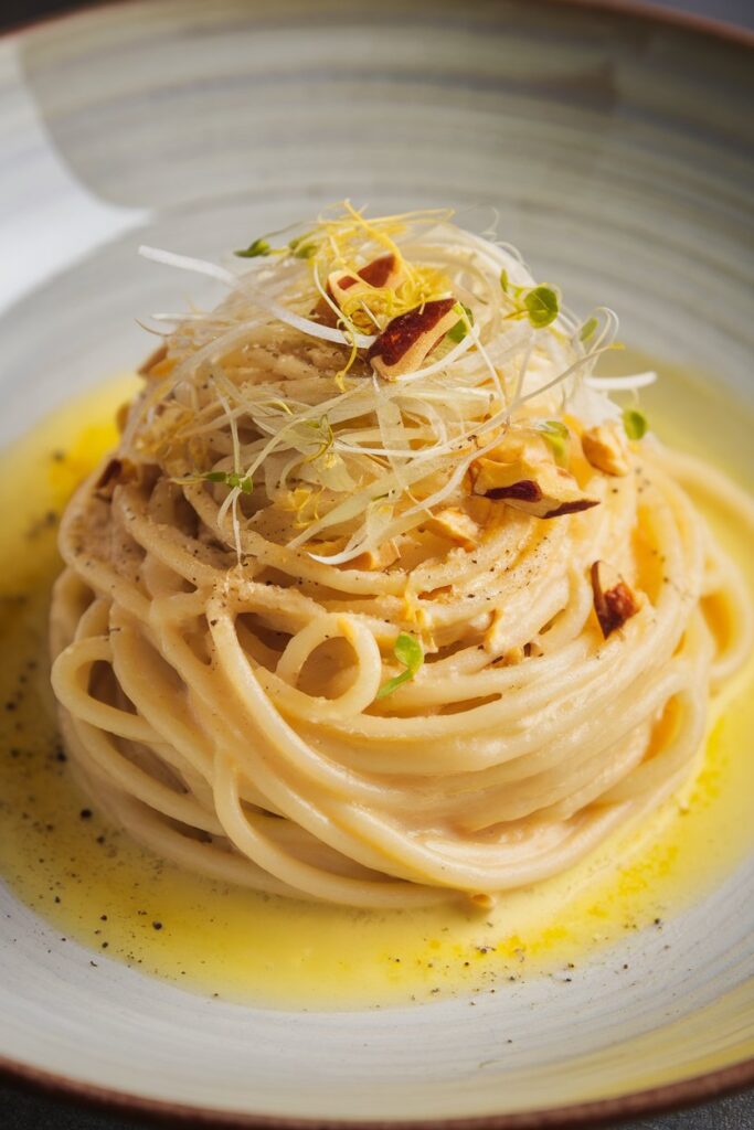 - Gesalzenes Nudelwasser aufsetzen und die Pasta knapp al dente kochen. 250 ml Nudelwasser auffangen – die Stärke dient als natürlicher Emulgator für eine glänzende Sauce.