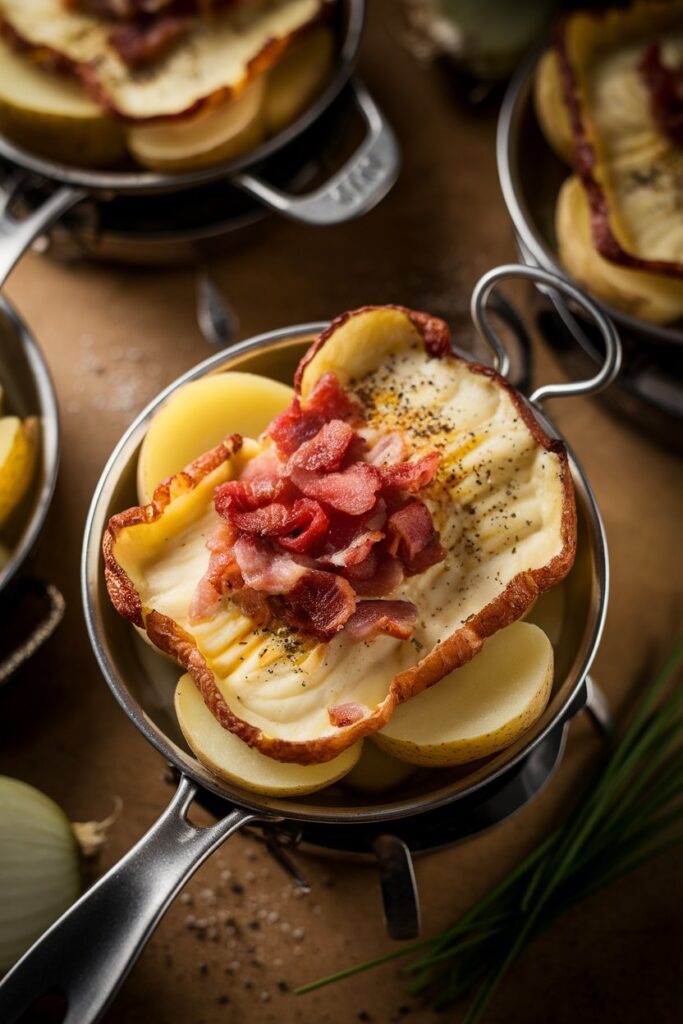 - Pfännchen dünn mit Kartoffelscheiben auslegen, ein paar Cornichons und Silberzwiebeln verteilen. So entsteht eine saftige Basis, die beim Überbacken nicht austrocknet.