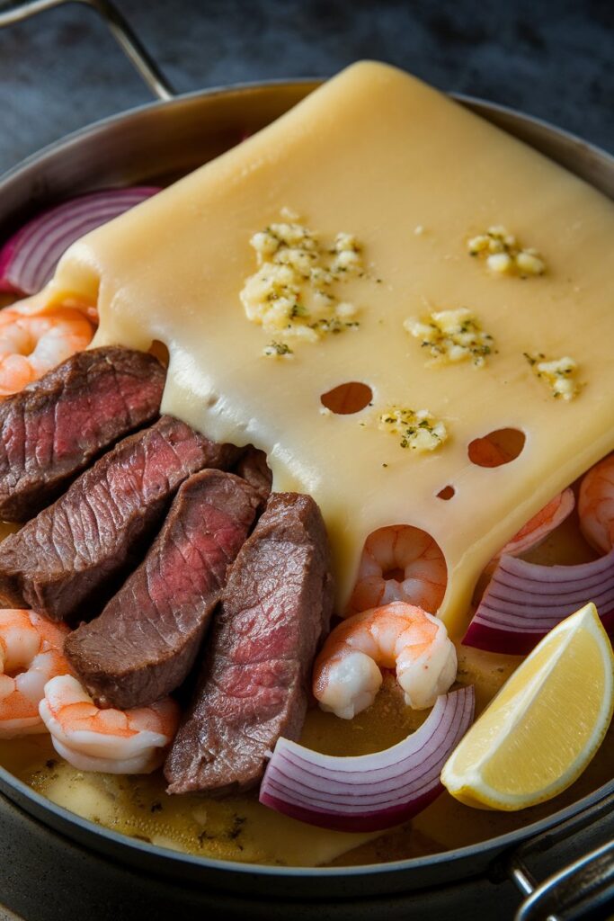 - Pfännchen mit Zwiebelspalten auslegen, Rind und Garnelen darauf verteilen und etwas Knoblauchbutter tupfen. Käse dünn darüber legen, pfeffern.