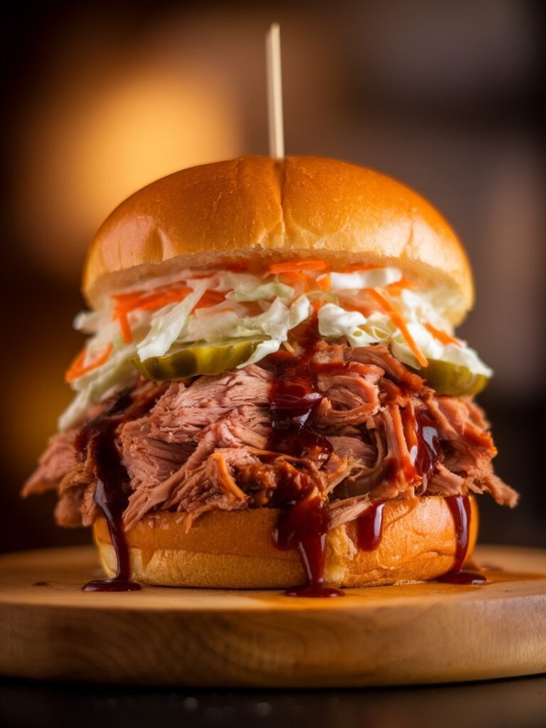 Pulled Pork Burger mit Coleslaw ist das Kronjuwel der amerikanischen BBQ-Küche – ein Gericht, das Geduld, Leidenschaft und die richtige Technik verlangt, und dafür mit einem Ergebnis belohnt, das in keinem Restaurant der Welt zu übertreffen ist. Butterweich geschmortes oder geräuchertes Schweinefleisch, das sich mit zwei Gabeln in saftige Fasern zieht, auf einem goldbraunen Brioche-Bun, gekrönt von cremigem Coleslaw – ein Gericht von epischen Dimensionen.