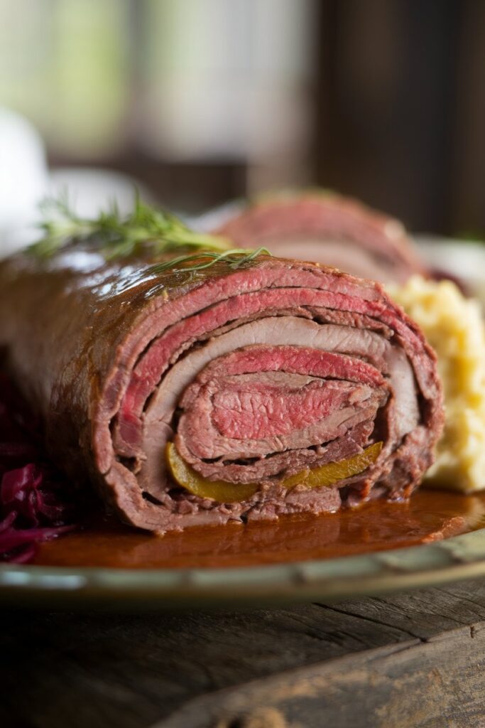 - Anrichten: Rouladen mit Sauce, Rotkohl oder Gurkensalat und Kartoffelpüree servieren. Außen zart, innen saftig – so muss das perfekte Sonntagsessen schmecken.
