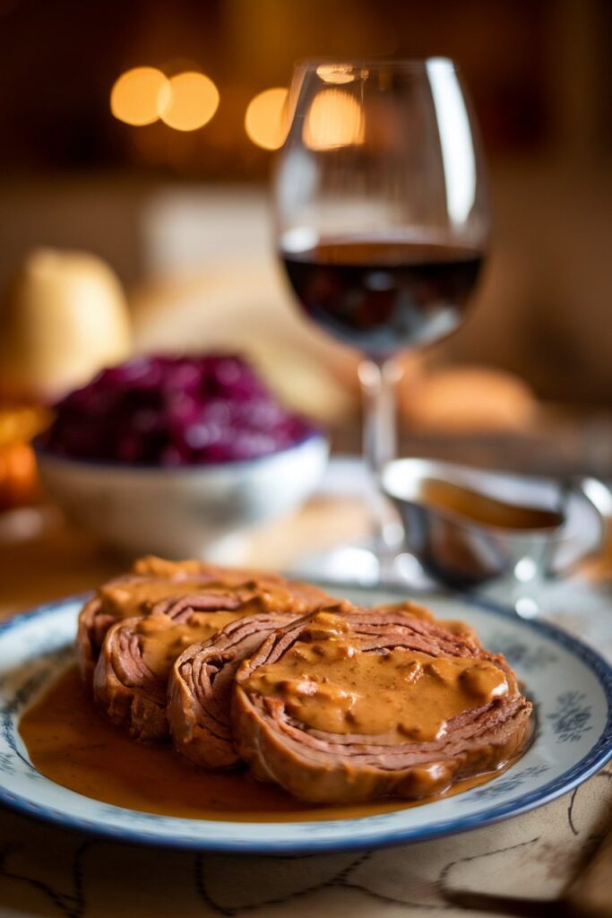 Ein kräftiger Rotwein wie Spätburgunder oder Bordeaux passt hervorragend zu den würzigen Rinderrouladen. Als Beilage harmonieren Rotkohl, Rosenkohl oder Erbsen und Möhren. Zum Abschluss empfiehlt sich ein leichtes Dessert – etwa Apfelstrudel oder Vanillecreme.