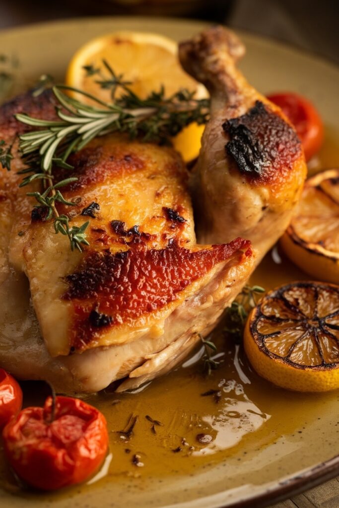 💡 Das fertige Zitronen-Hühnchen präsentiert sich mit einer tief goldbraunen, knusprigen Haut – innen saftig, zart und von der aromatischen Marinade bis in den letzten Winkel durchdrungen.