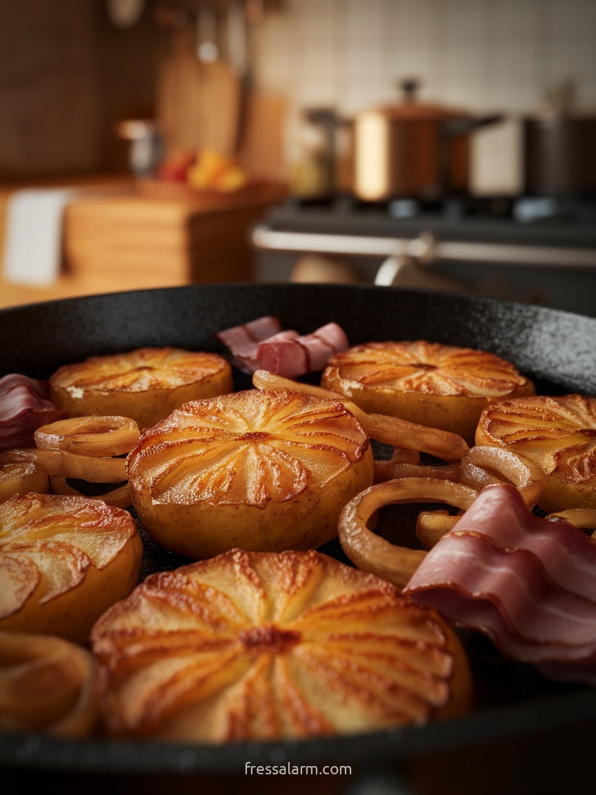 Die Pfanne bei mittlerer bis hoher Hitze vollständig vorheizen bevor das Fett hineinkommt. Eine heiße Pfanne – nicht überhitzt, aber wirklich heiß – gibt sofort eine Kruste wenn die Kartoffeln eingelegt werden. Bei zu niedriger Hitze zieht Feuchtigkeit heraus statt sich eine Kruste zu bilden. Schmalz oder Butterschmalz geben den besten Geschmack; Öl mit hohem Rauchpunkt ist ebenfalls gut.