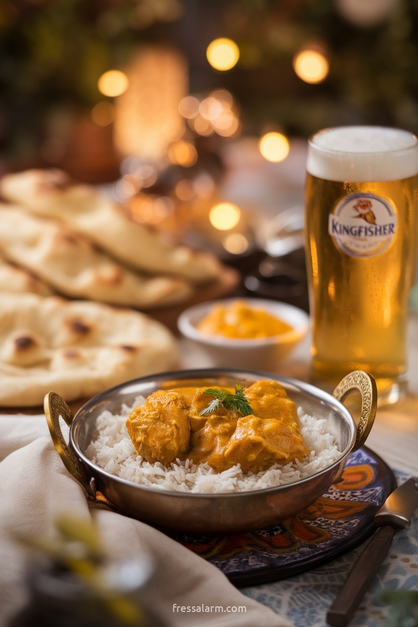 Zu Hähnchen-Curry mit Basmatireis passt ein indisches Kingfisher-Bier, ein Mango-Lassi oder alkoholfrei ein Minz-Limetten-Wasser. Ein gekühlter Gewürztraminer aus dem Elsass harmoniert überraschend gut mit den Curry-Aromen.