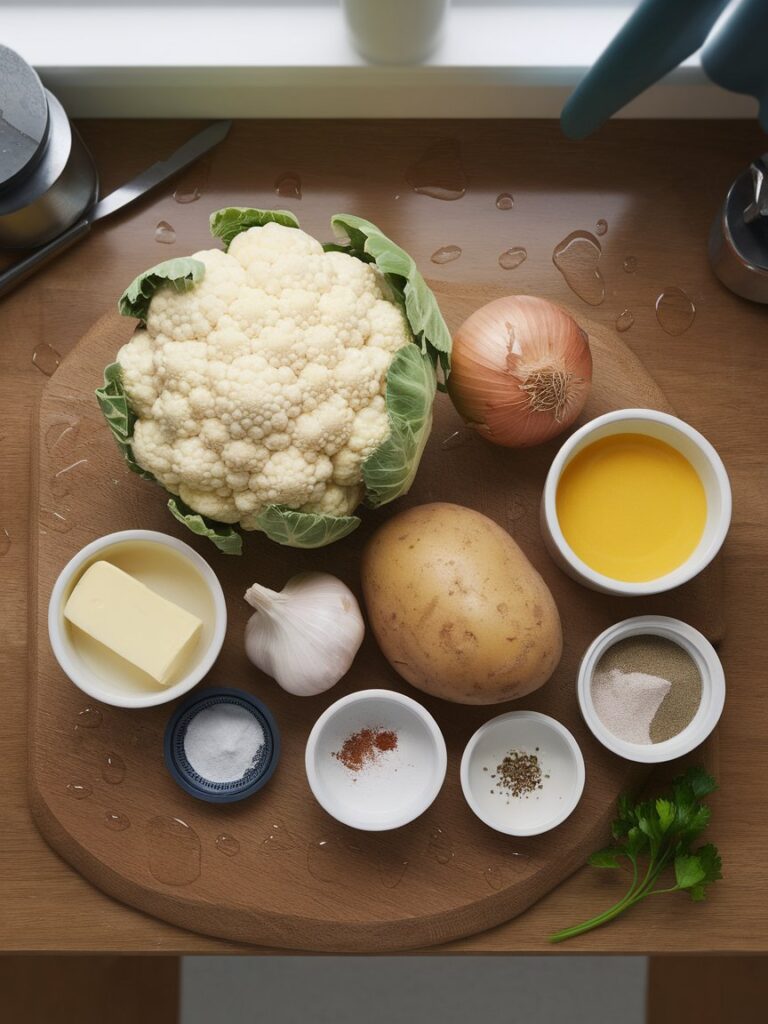 - Gemüse vorbereiten: Den Blumenkohl waschen, in kleine Röschen teilen und den Strunk grob würfeln. Kartoffel, Zwiebel und Knoblauch schälen und ebenfalls in Stücke schneiden.