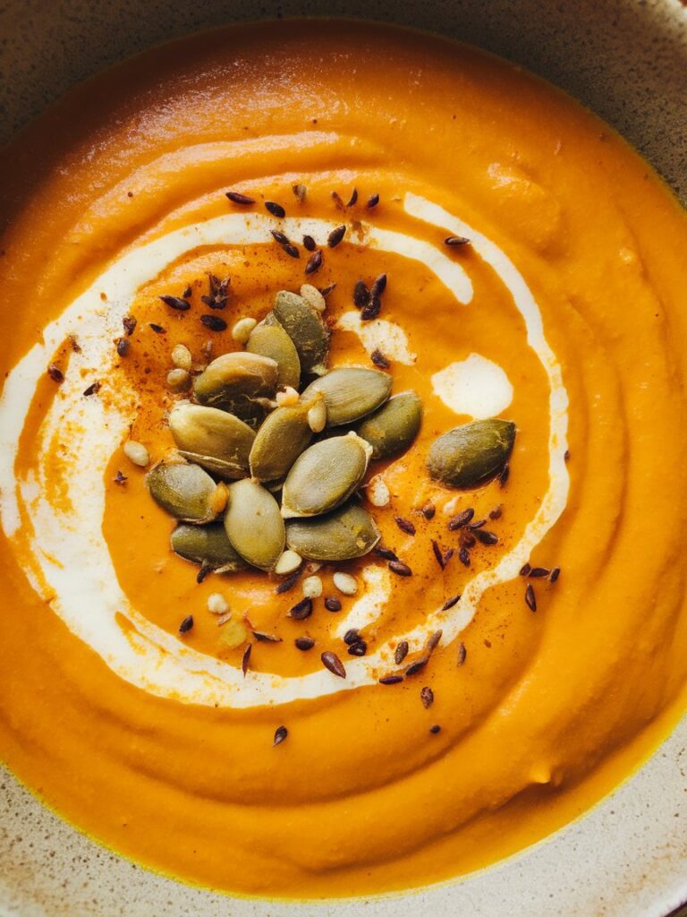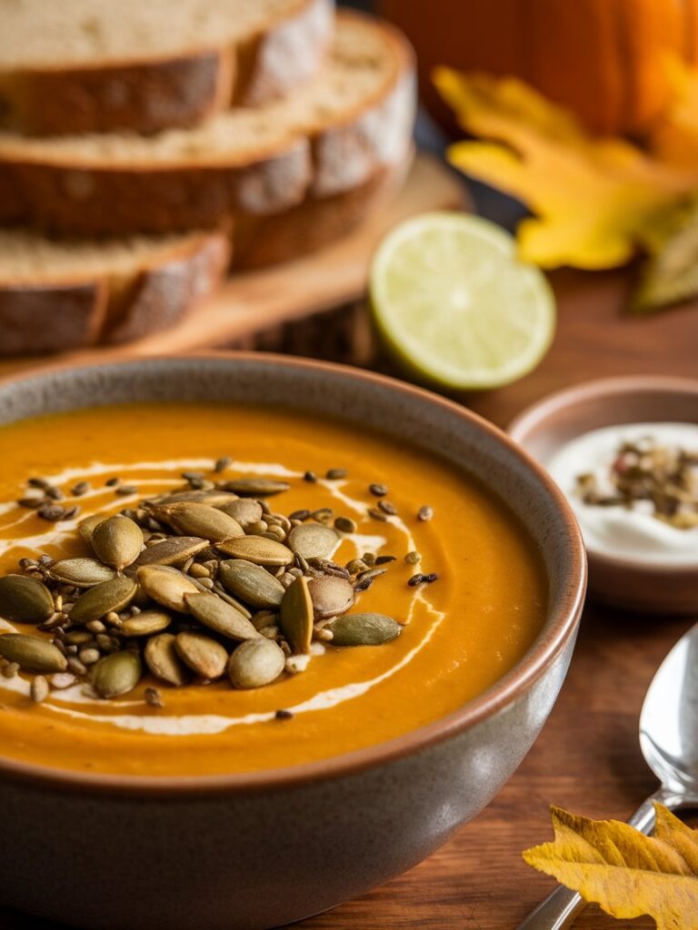 - Servieren: Suppe in tiefen Tellern oder Schüsseln anrichten, mit Kürbiskernen und frischen Kräutern bestreuen. Dazu passt knuspriges Brot.