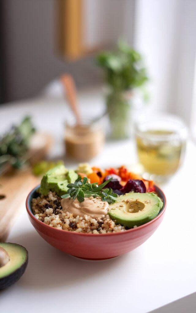 Dieses Rezept zeigt den Aufbau einer vollwertigen veganen Bowl mit maximaler Nährstoffdichte, optimaler Texturvielfalt und einem Tahini-Dressing, das du für immer machen wirst.