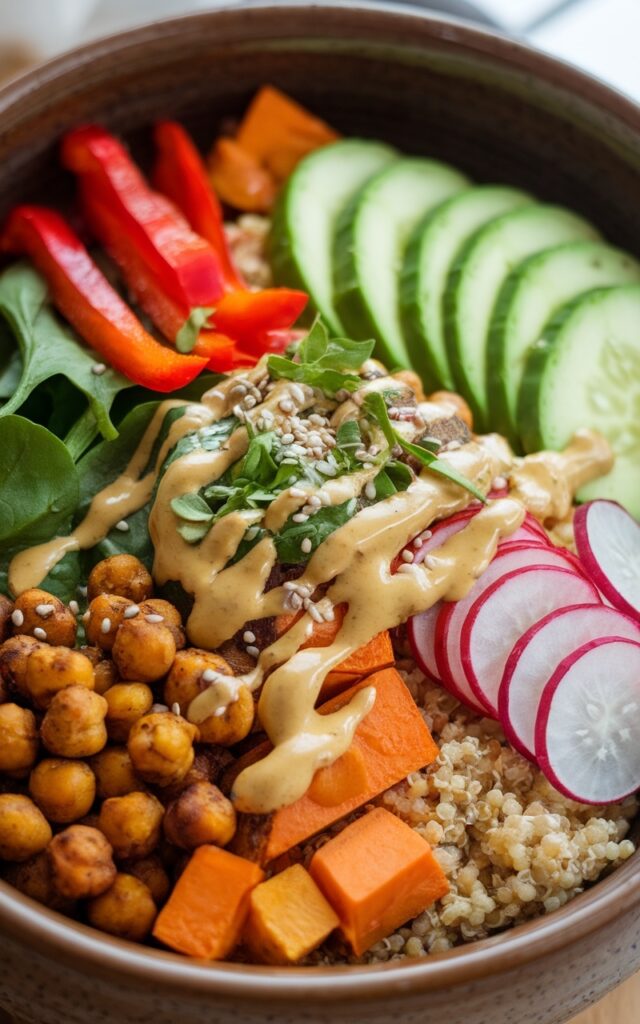 Die vegane Buddha-Bowl mit Tahini-Dressing ist das Paradebeispiel moderner, pflanzlicher Küche – und eines der meistgepinnten veganen Rezepte auf Pinterest überhaupt. Eine bunte Komposition aus geröstetem Gemüse, Quinoa, knusprigen Kichererbsen, frischem Grün und einem seidigen Sesam-Dressing: sättigend, nährstoffreich und fotografisch atemberaubend.
