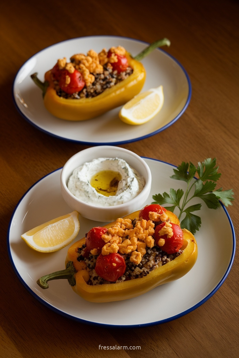 Als leichte Beilage einen griechischen Joghurt-Kräuterdip anrühren (Joghurt, Knoblauch, Dill, Zitronensaft) und in einem kleinen Schälchen danebenstellen – der kühle Joghurt-Dip ergänzt die heiße, würzige Paprika-Füllung.