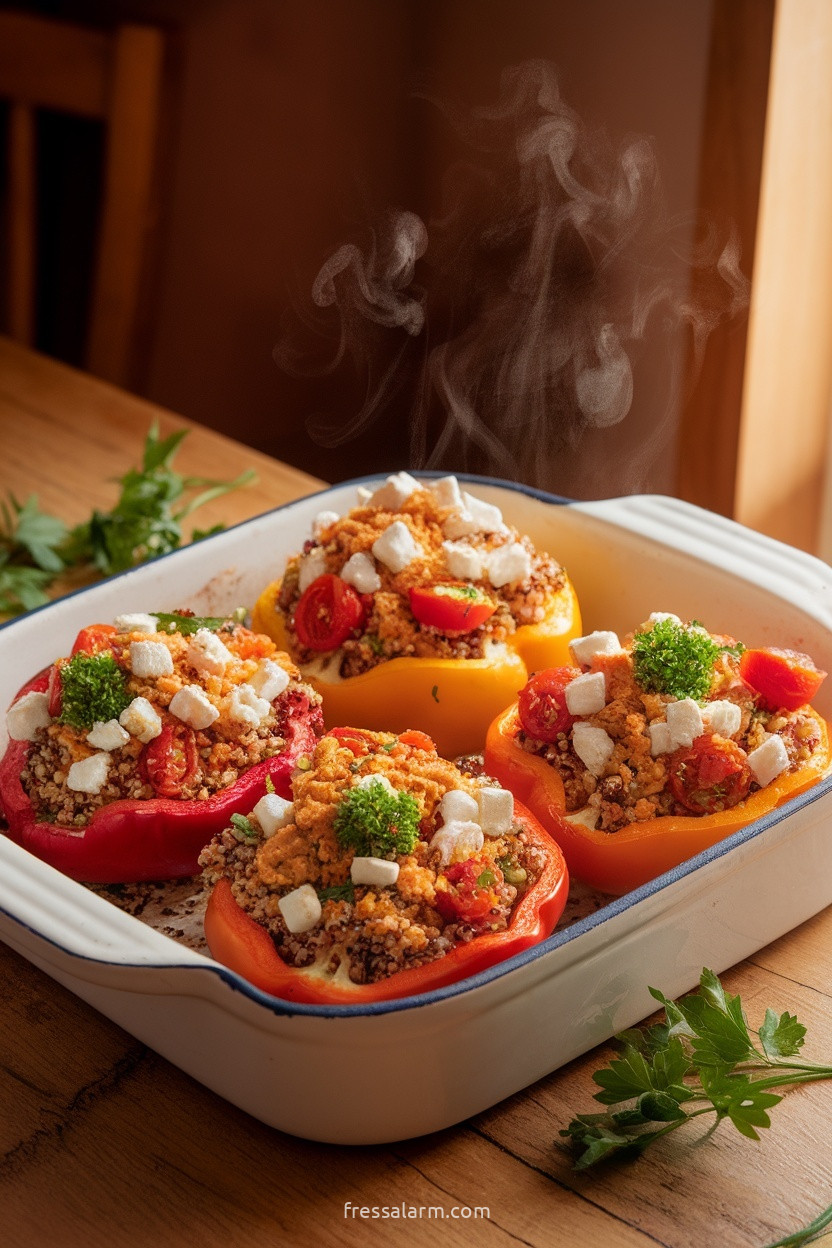 Gefüllte Paprika haben eine lange Geschichte in der mediterranen Küche – von griechischen Piperies Gemistés bis zu türkischen Biber Dolması und italienischen Peperoni ripieni. Das Prinzip, Gemüse als essbare Schüssel zu nutzen und mit Getreide und Käse zu füllen, ist quer durch alle mediterran-beeinflussten Küchen verbreitet.