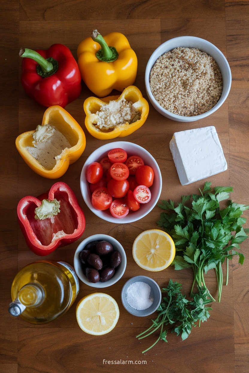 Die Füllung zusammenstellen während der Quinoa kocht: Den abgekühlten Quinoa in einer großen Schüssel mit 150 g zerbröseltem Feta (davon 50 g für die Garnitur zurückhalten), 150 g halbierte Kirschtomaten, 2 EL gehackte schwarze Oliven, 2 EL frische Petersilie, 1 EL frischer Oregano (oder 1 TL getrockneter), 1 EL Olivenöl, Saft von ½ Zitrone, Salz und reichlich frisch gemahlenem Pfeffer vermischen. Die Füllung soll nach dem Mischen aromatisch, feucht und zusammenhaltend sein – falls sie zu trocken wirkt, noch etwas Olivenöl einrühren.