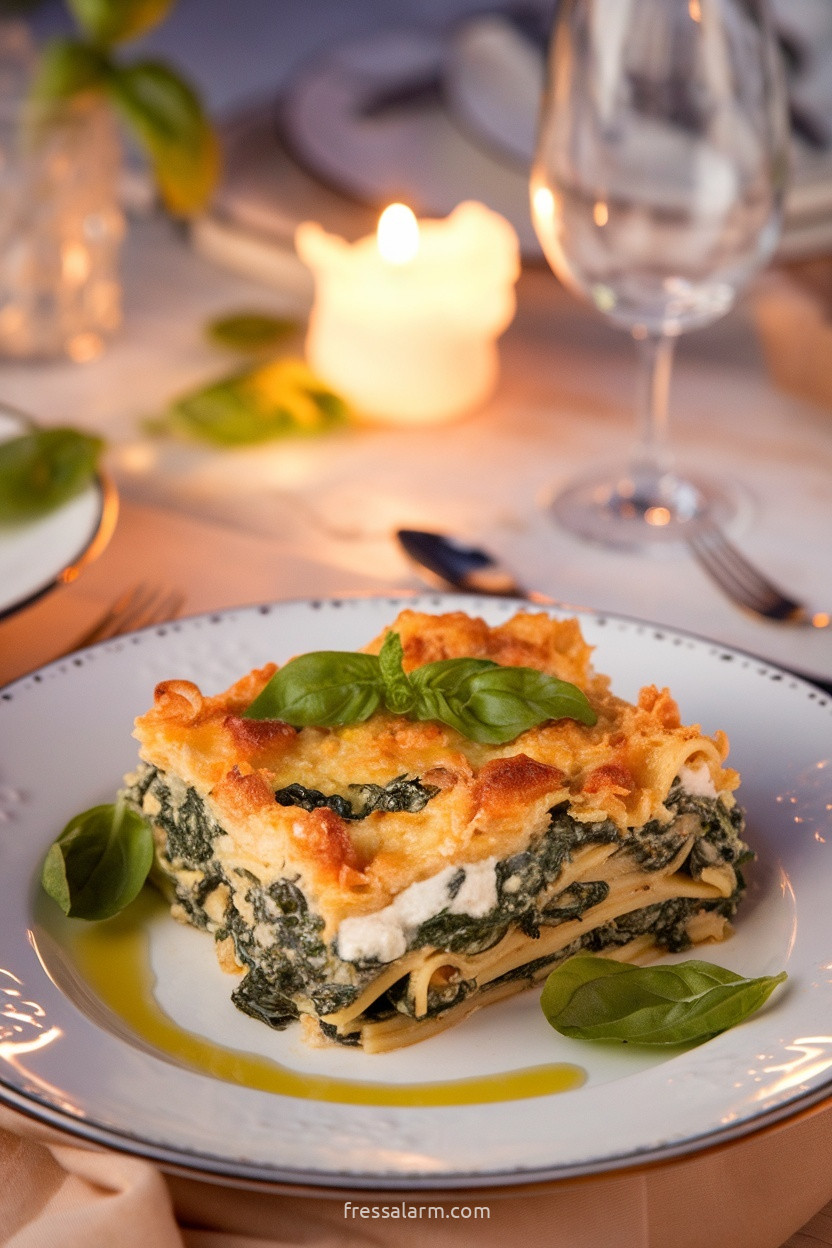Den vegetarischen Nudelauflauf in großzügige Quadrate schneiden und auf vorgewärmten Tellern mit einem Basilikumblatt und einem Faden hochwertigem Olivenöl anrichten. Die goldbraune Ricotta-Käsekruste soll oben bleiben.