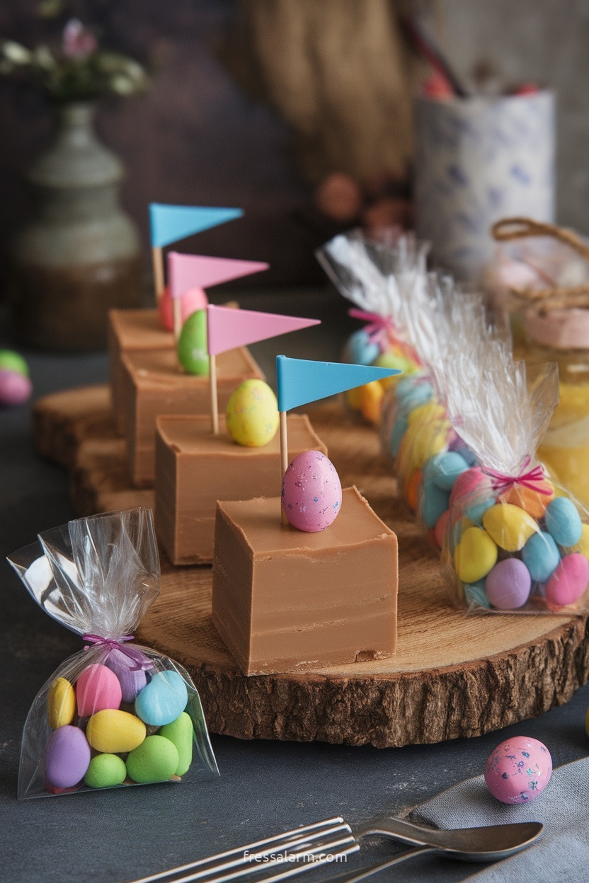 Das Fudge auf einem rustikalen Holzbrett in einer Reihe anrichten – die bunten Schokoladen-Ostereier obendrauf und die cremige beige Farbe des Fudges ergeben ein schönes farbliches Gleichgewicht. Mit kleinen Osterfahnen-Picks bestückt oder in kleinen Papierhüllen serviert sieht das Fudge-Tablett aus wie ein Candy-Shop-Arrangement.