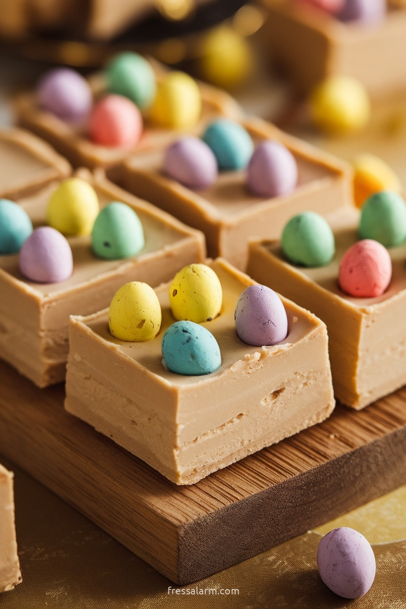 Fudge mit bunten Schokoladen-Ostereiern auf rustikalem Holzbrett – cremige Karamell-Fudge-Quadrate mit Mini-Ostereiern