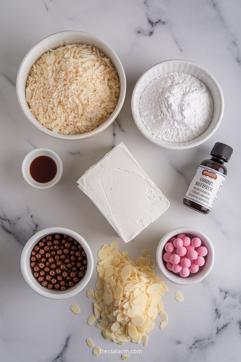 - Schritt 1: Kokosflocken, Frischkäse, Puderzucker, Vanille und Salz zu einer gleichmäßigen Masse kneten.