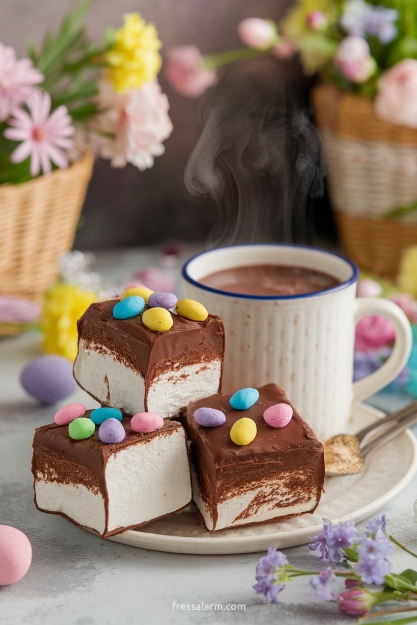 Schokoladen-Marshmallows passen perfekt zu heißer Schokolade – darin aufgelöst ergeben sie eine ultra-cremige Kakao-Delikatesse die kein Café der Welt so hinbekommt wie man selbst. Als Oster-Nachmittags-Ritual: heiße Schokolade kochen, Marshmallow hinzufügen, Blumenstrauß auf den Tisch stellen und den Frühlingsnachmittag genießen.