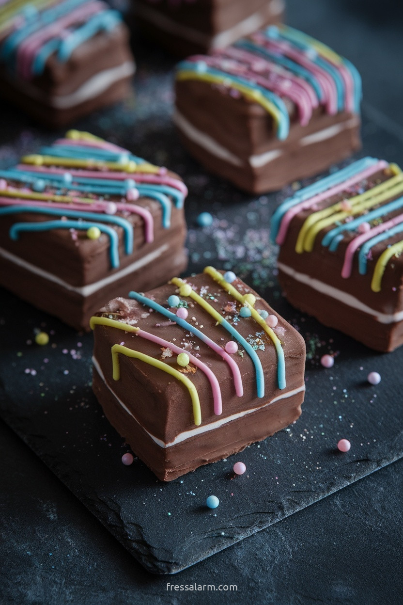 Die Schokoladen-Marshmallows auf einem dunklen Schieferbrett oder schwarzem Tablett präsentieren – der Kontrast zwischen dem dunklen Hintergrund und den bunten Zuckerglasur-Dekorationen macht jedes Marshmallow zu einem kleinen Kunstwerk. Mit einem Holzspieß zum Aufnehmen danebenstellen für saubere Handhabung.