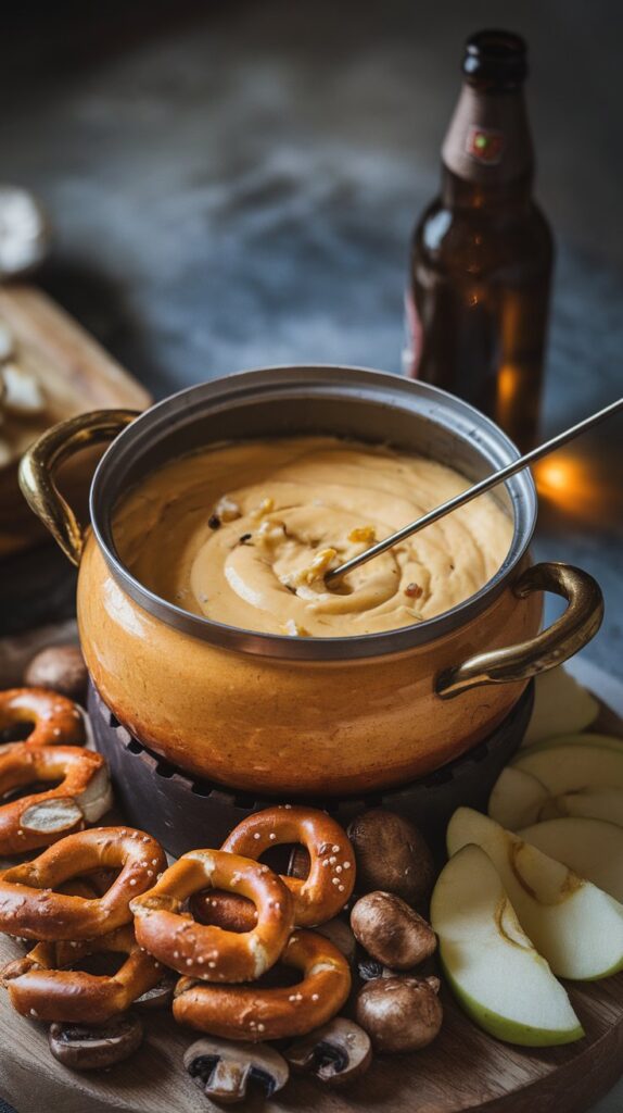 - Zum Dippen: Laugengebäck (in Würfeln), gebratene Pilze, Apfelspalten