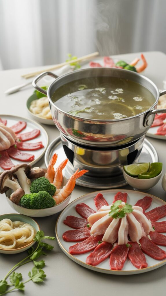 - Jeder gart seine Stücke direkt in der Brühe: Rind 10–20 Sekunden, Hähnchen 60–90 Sekunden, Garnelen 60–90 Sekunden, Gemüse je nach Sorte 30–120 Sekunden. Dünne Scheiben und kleine Stücke halten den Fluss am Tisch aufrecht.