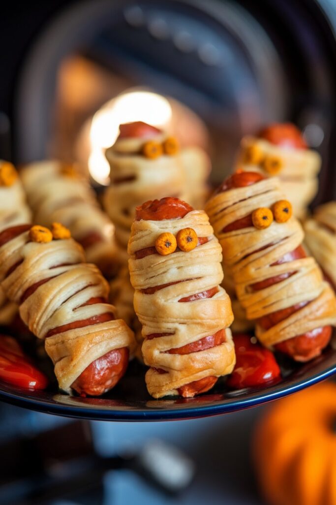 4. Leicht abkühlen lassen und mit Senf/Ketchup Augenpunkte setzen oder Zuckeraugen ankleben. So bekommen die Mumien ihren Blick und bleiben handlich.