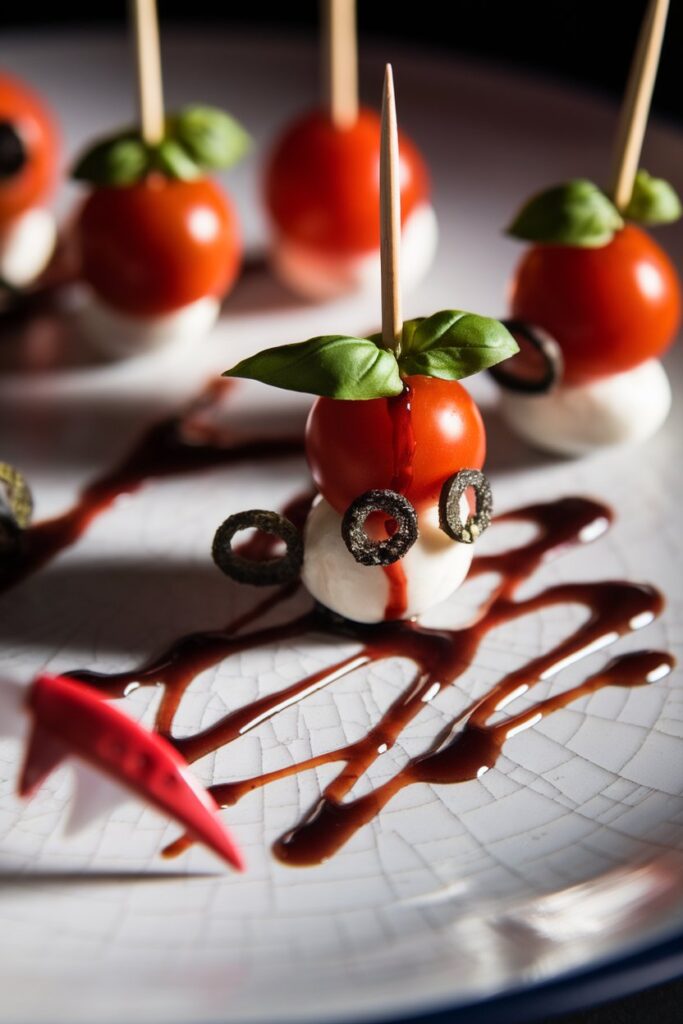3. Mit feinen Fäden Balsamico-Creme über die Spieße „sprenkeln“. Die dunkle Sauce sorgt für den blutigen Look und eine süß-säuerliche Note.