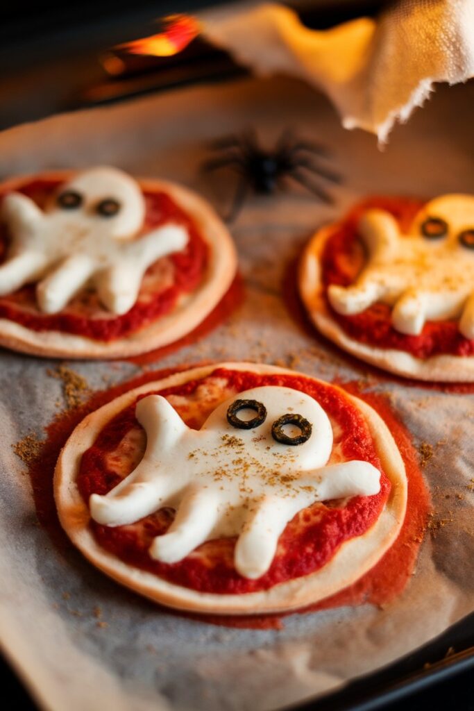 3. Mozzarella als Geisterformen auflegen, Olivenringe als Augen/Mund platzieren. Mit Oregano, Salz und Pfeffer würzen und mit einem Hauch Öl beträufeln.