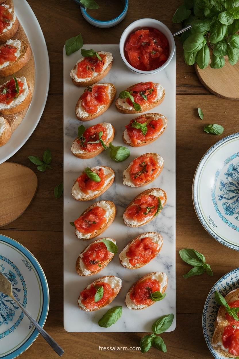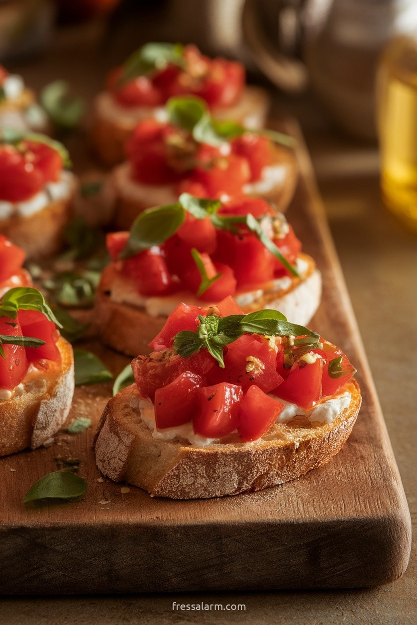 Mini-Bruschetta auf einem langen Holzbrett oder einer Marmorplatte präsentieren. Das Tomaten-Topping in einer hübschen kleinen Schüssel danebenstellen damit Gäste nach Belieben selbst belegen können – so bleibt das Brot länger knusprig. Ein kleines Kärtchen mit der Aufschrift ‚Bruschetta‘ gibt bei formellen Anlässen einen eleganten Touch.