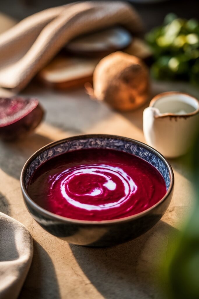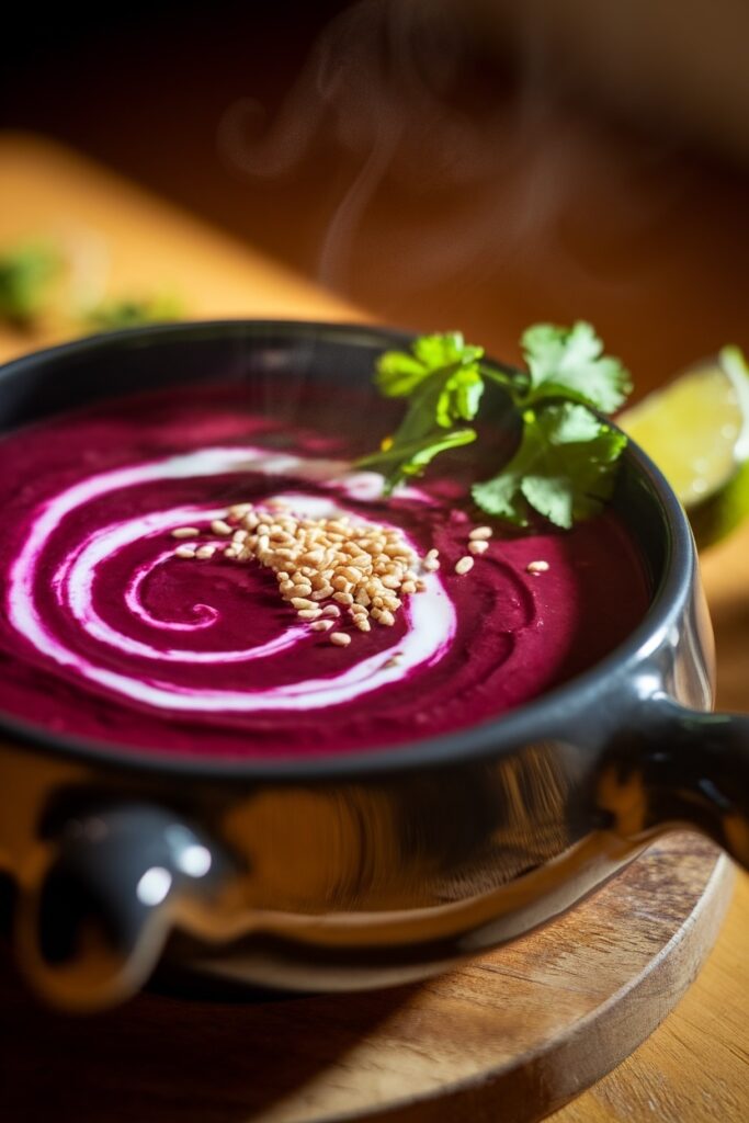 💡 Die fertige Suppe leuchtet in sattem Purpurrot mit einem weißen Kokoscreme-Swirl – visuell spektakulär und geschmacklich von großer Tiefe.